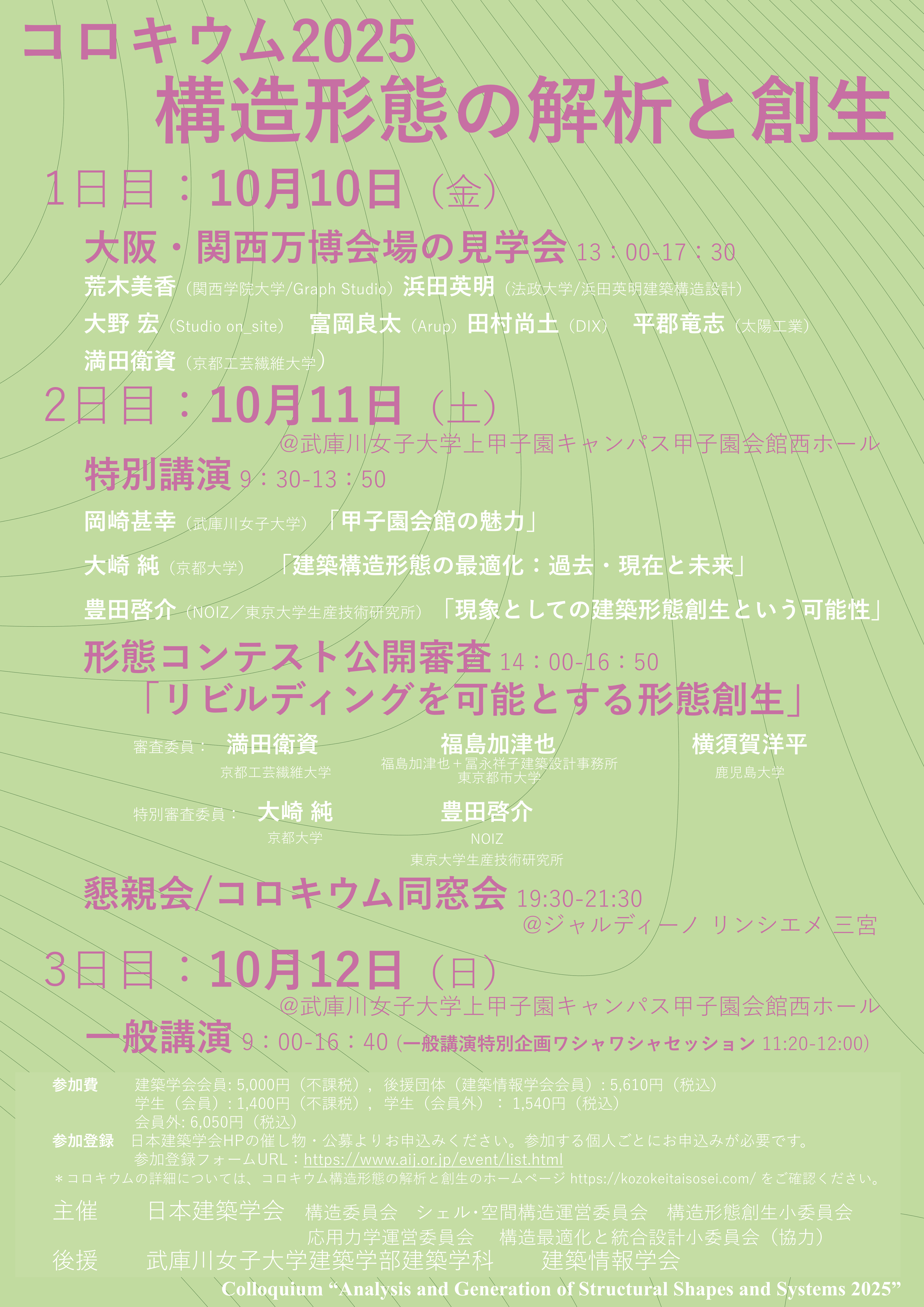 本年度開催する「第20回 コロキウム構造形態の解析と創生2025」では、これまでと同様に形態創生の理論・技術に関わる研究者、技術者が一堂に会して最新の情報を交換すると同時に、大阪・関西万博が開催されている関西方面に開催地を移し、甲子園会館を会場として、先進的な創造性と革新的な社会課題の解決策を体感するとともに、これまでの理論・技術の蓄積とこれからの未来社会に向けた開発・実装を考えます。それらを具体的な建築物、プロジェクトなどに応用した事例紹介についても議論することで、これらの研究・技術分野が益々発展することを期待して開催されます。